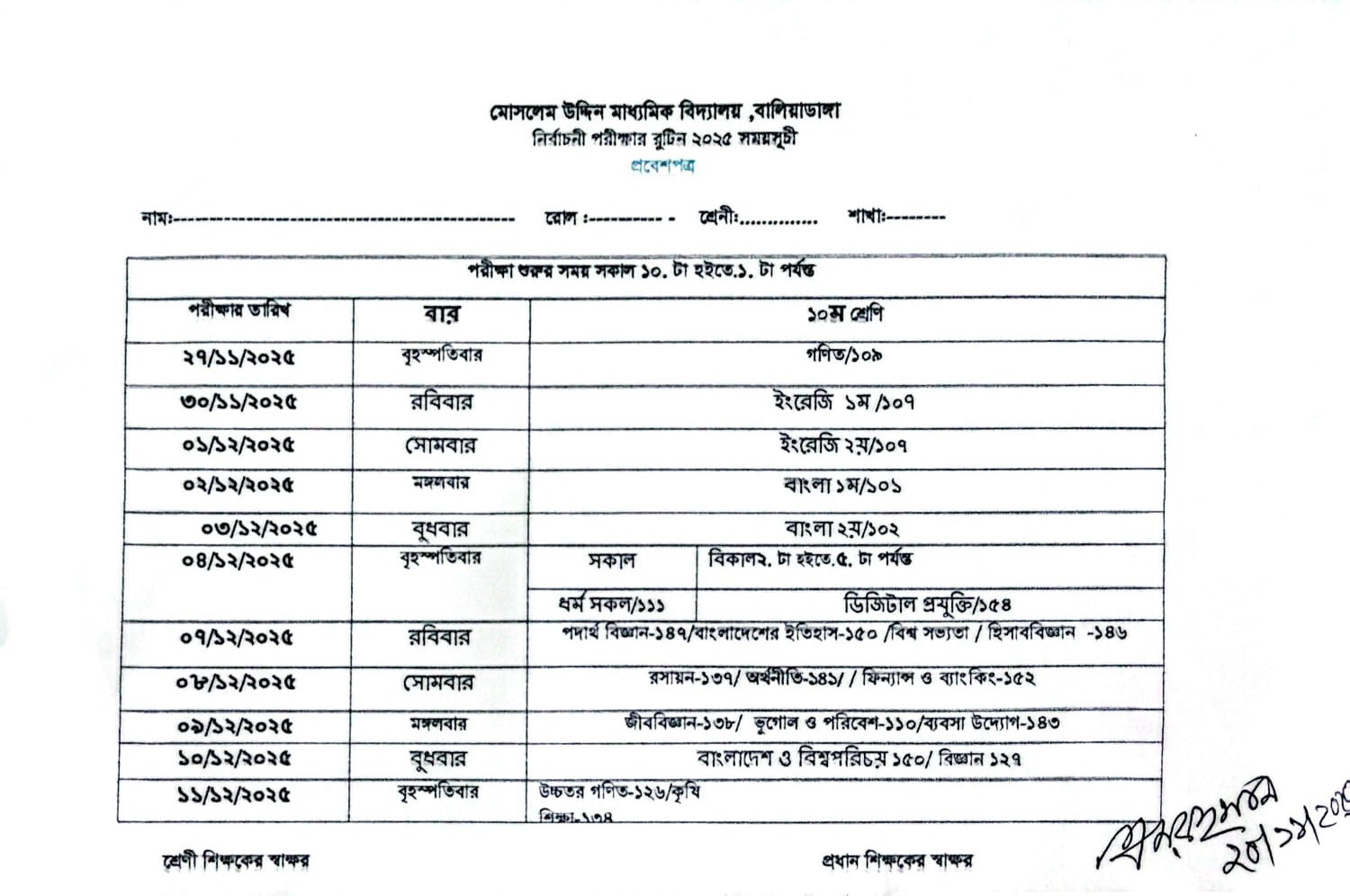 ২৭/১১/২০২৫ খ্রি. তারিখ দশম শ্রেণির নির্বাচনী পরীক্ষা-২০২৫ অনুষ্ঠিত হবে।